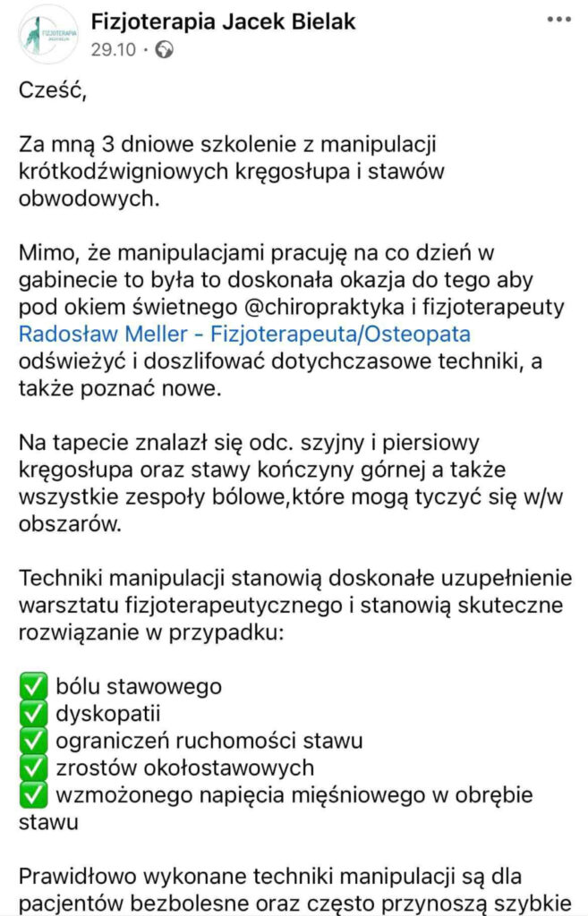 Chiropraktyka i HVLA to fundament mojej pracy klinicznej — szybkie, precyzyjne, bezpieczne techniki, na których opieram większość interwencji,