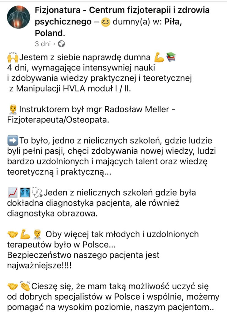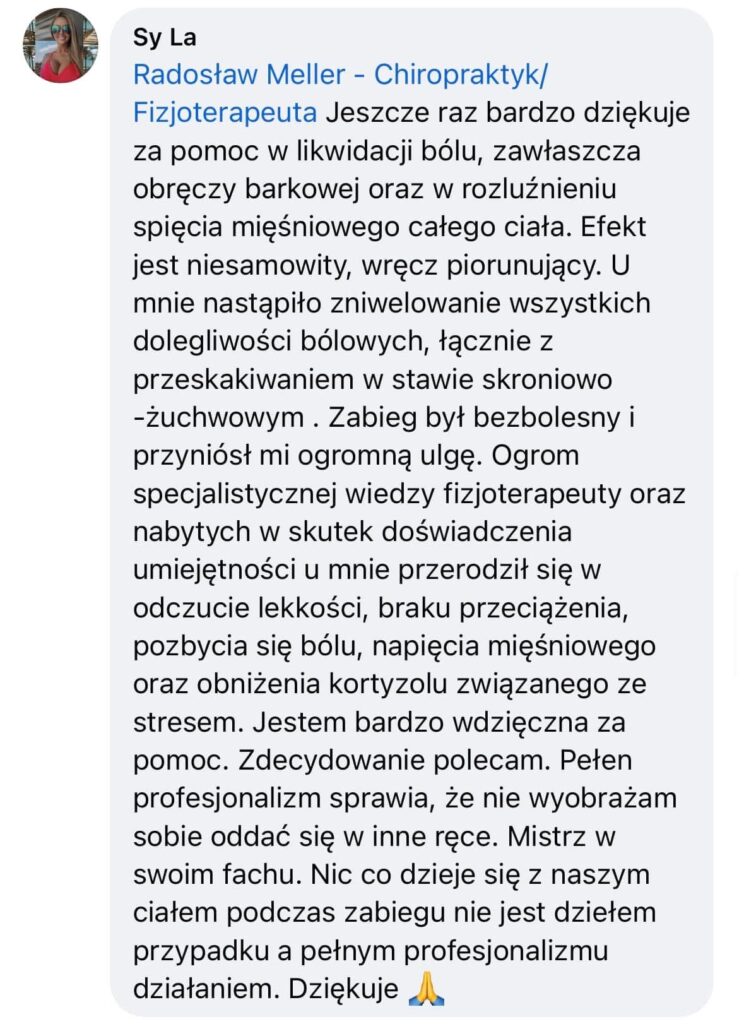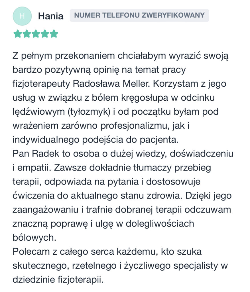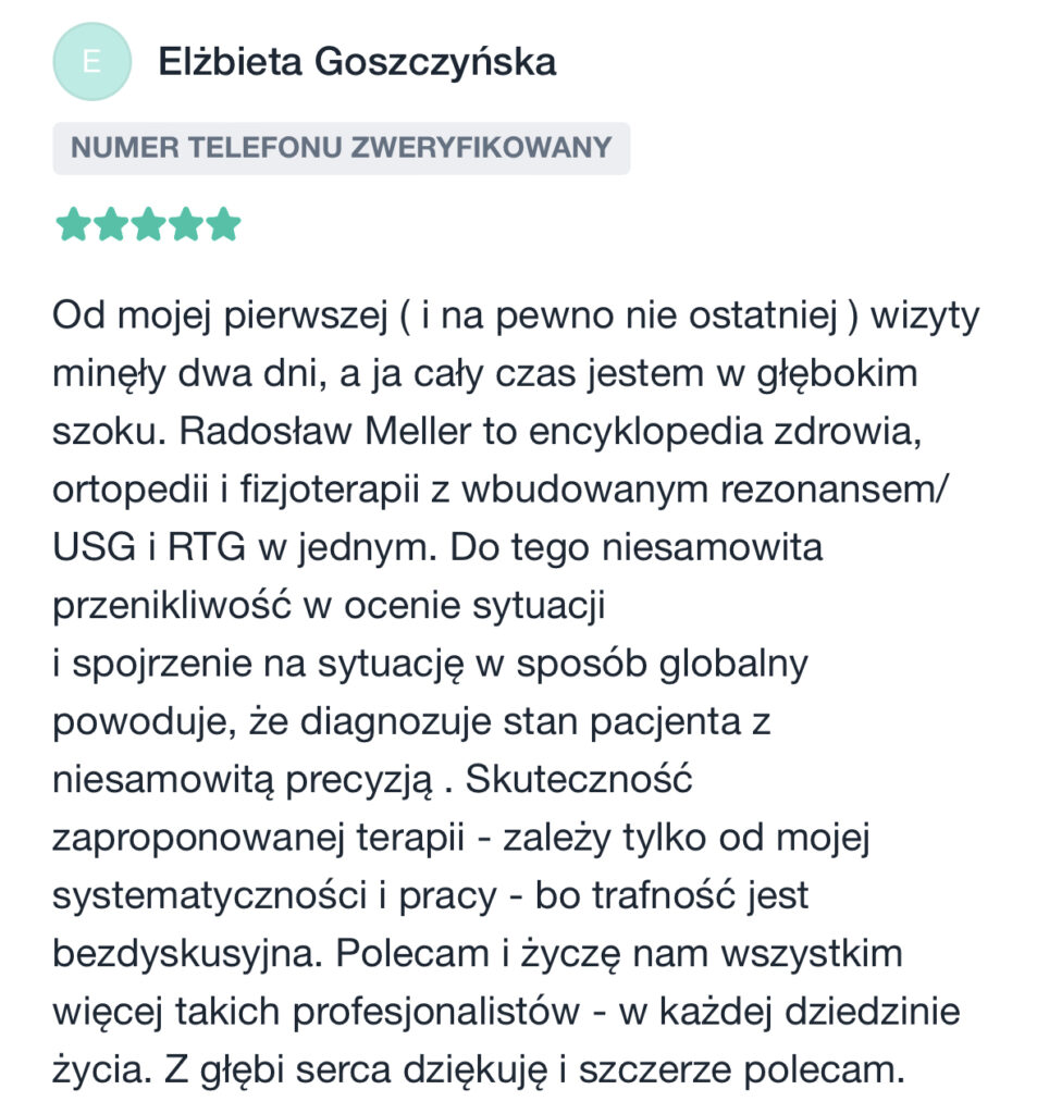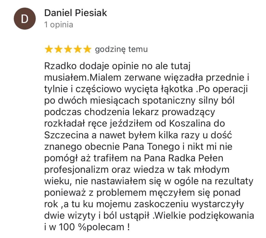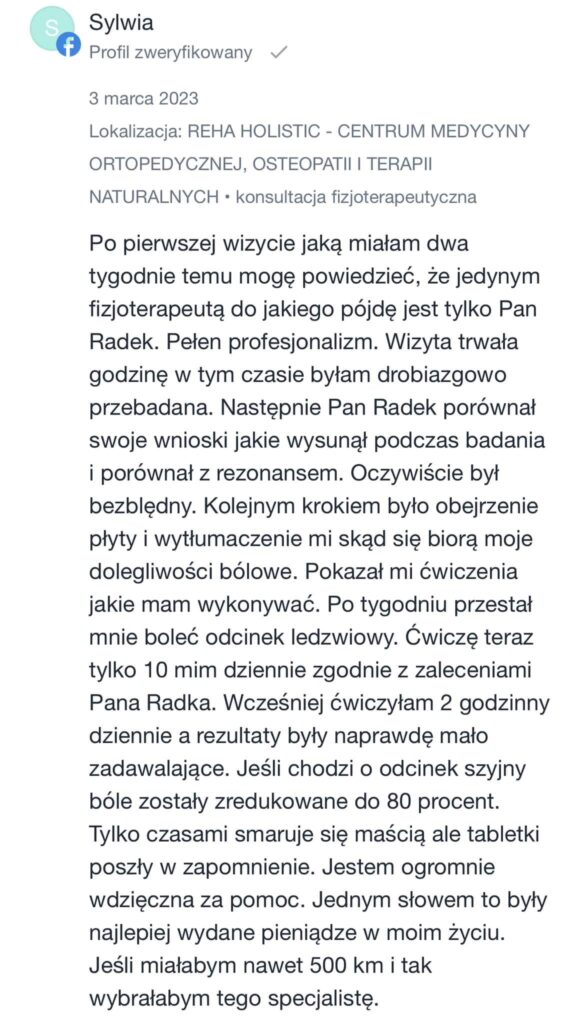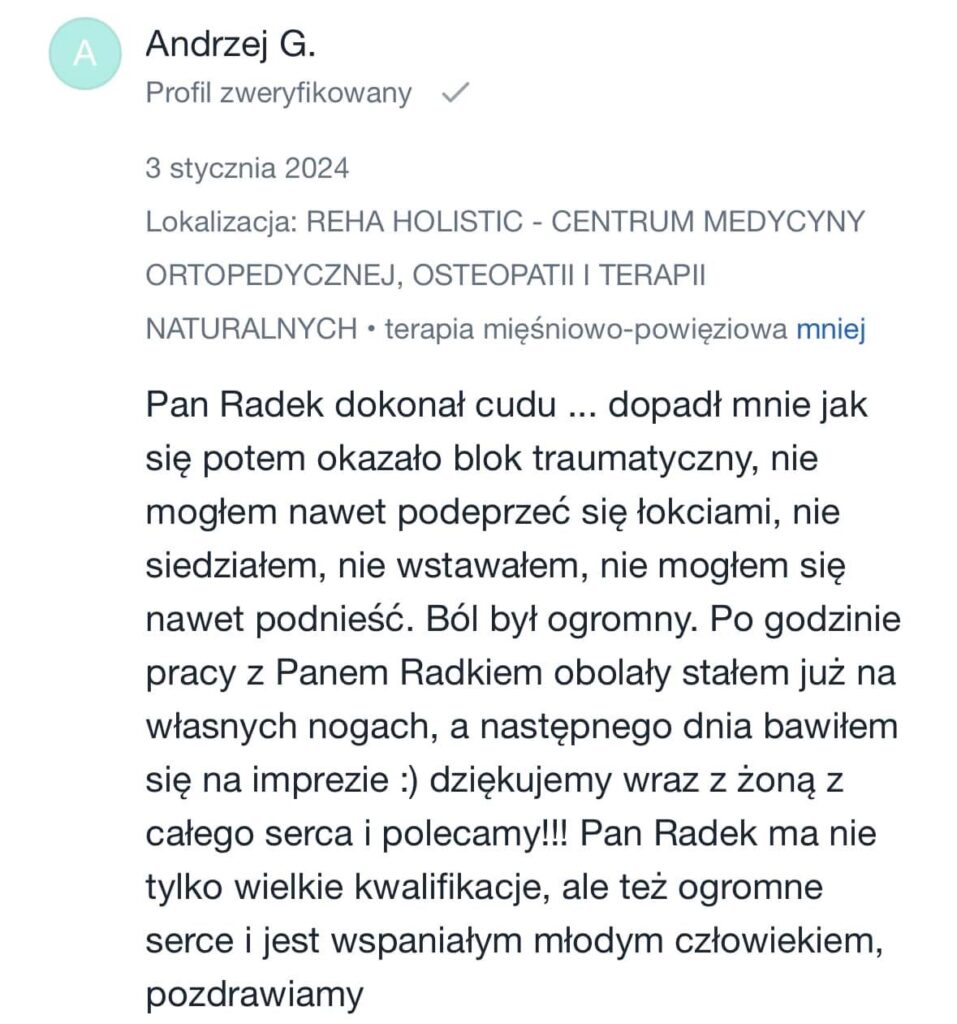 Zanim klikniesz „kupuję”, rzuć okiem na opinie moich pacjentów. To rezultaty pracy wykonanej dokładnie tymi technikami, których uczę w tym kursie — krok po kroku, z prostymi protokołami do powtórzenia. Te same narzędzia, ta sama metodyka, te same przewidywalne efekty. Aktualnie czas oczekiwania na wizytę to 3 miesiące.