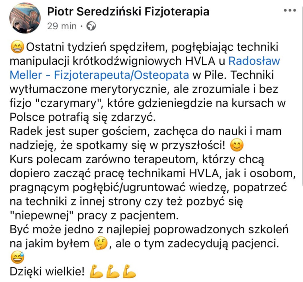 Nie ma terapii uniwersalnej — każdy przypadek to inna biomechanika. W moim kursie online dostajesz praktyczne narzędzia: szybką ocenę, bezpieczne i precyzyjne HVLA, integrację z technikami tkanek miękkich, pracą wisceralną i neuromobilizacją. Minimum teorii, maksimum zastosowania.