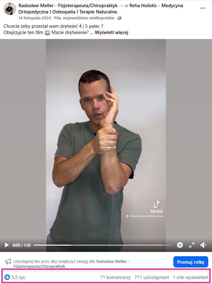 Ten jeden posty wygenerował 529 tyś wyświetleń na Facebooku, 182 tyś wyświetleń na Instagramie i 95 tyś wyświetleń na TikToku.